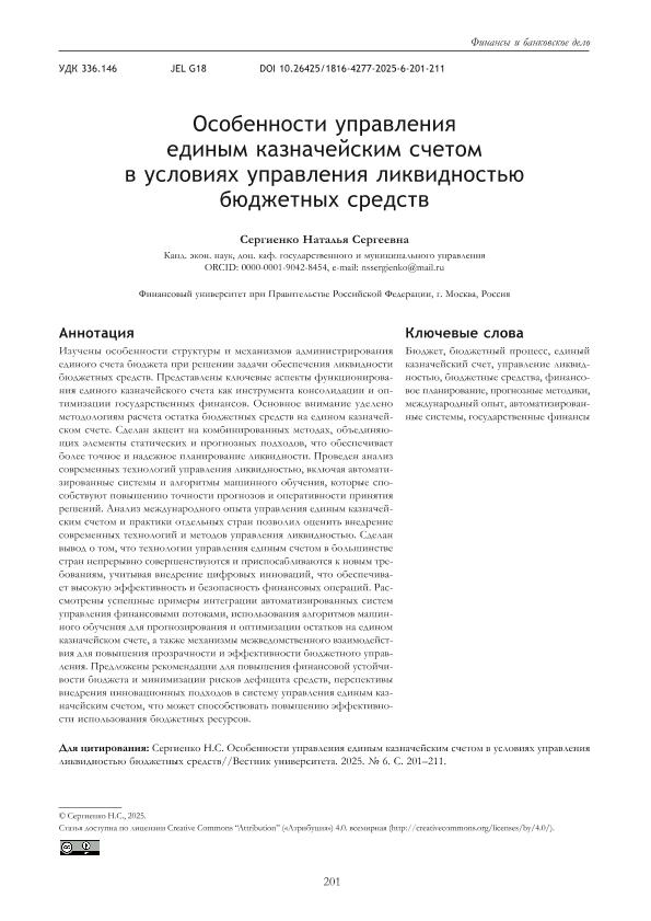 Сергиенко, Н.С. Особенности управления единым казначейским счетом в условиях управления ликвидностью бюджетных средств // Вестник университета. – 2025. – № 6. — С. 201-211. — Только в электронном виде. — <URL:http://elib.fa.ru/art2025/bv1448.pdf>.