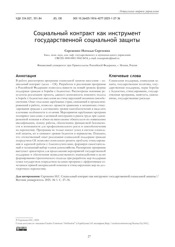 Сергиенко, Н.С. Социальный контракт как инструмент государственной социальной защиты // Вестник университета. – 2025. – № 1. — С. 27-36. — Только в электронном виде. — <URL:http://elib.fa.ru/art2025/bv1449.pdf>.