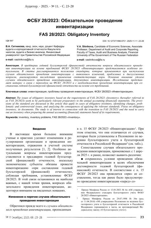Ситникова, В.А. ФСБУ 28/2023: Обязательное проведение инвентаризации // Аудитор. – 2025. – № 11. — С. 23-28. — Хранение – Верхняя Масловка, 15. — <URL:http://elib.fa.ru/art2025/bv1450.pdf>.