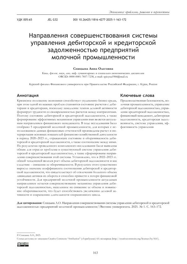 задолженностью предприятий молочной промышленности // Вестник университета. – 2025. – № 1. — С. 163-172. — Только в электронном виде. — <URL:http://elib.fa.ru/art2025/bv1451.pdf>.