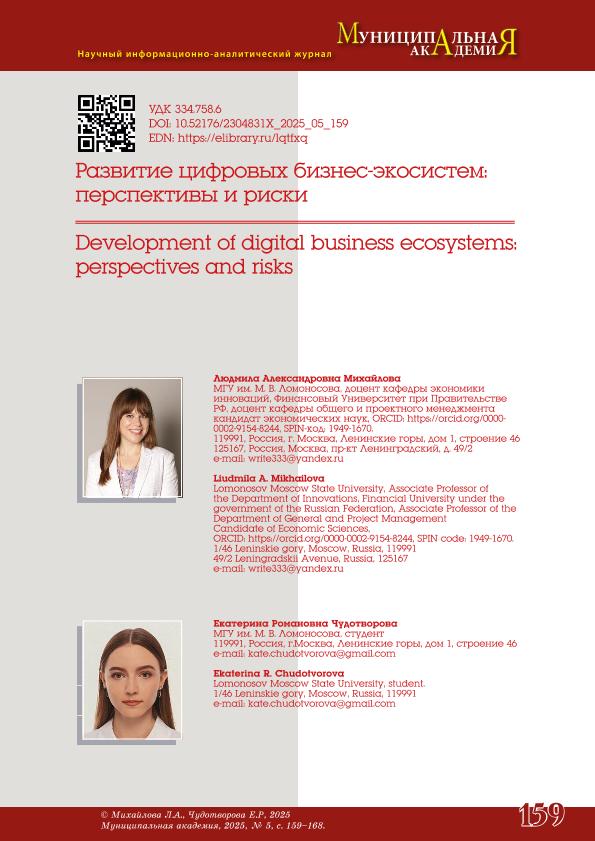 Михайлова, Л.А. Развитие цифровых бизнес-экосистем: перспективы и риски / Л.А. Михайлова, Е.Р. Чудотворова // Муниципальная академия. – 2025. – № 5. — С. 159-168. — Только в электронном виде. — <URL:http://elib.fa.ru/art2025/bv1440.pdf>.