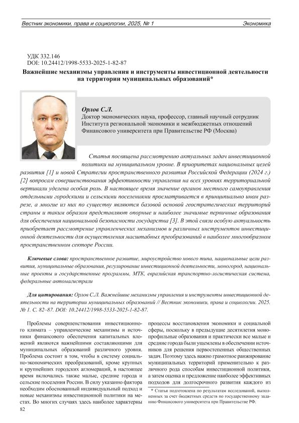 Орлов, С.Л. Важнейшие механизмы управления и инструменты инвестиционной деятельности на территории муниципальных образований // Вестник экономики, права и социологии. – 2025. – № 1. — С. 82-87. — Только в электронном виде. — <URL:http://elib.fa.ru/art2025/bv1441.pdf>.