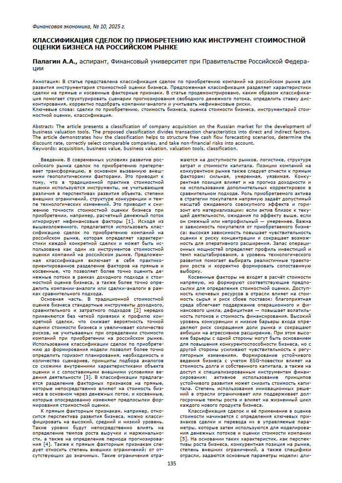 Палагин, А.А. Классификация сделок по приобретению как инструмент стоимостной оценке бизнеса на российском рынке // Финансовая экономика. – 2025. – № 10. — С. 135-137 — <URL:http://elib.fa.ru/art2025/bv1442.pdf>.
