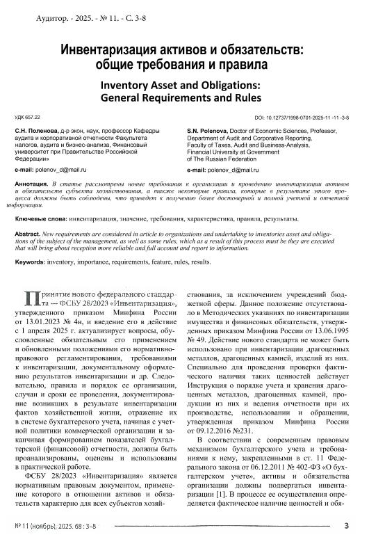 Поленова, С.Н. Инвентаризация активов и обязательств: общие требования и правила // Аудитор. – 2025. – № 11. — С. 3-8. — Хранение – Верхняя Масловка, 15. — <URL:http://elib.fa.ru/art2025/bv1443.pdf>.