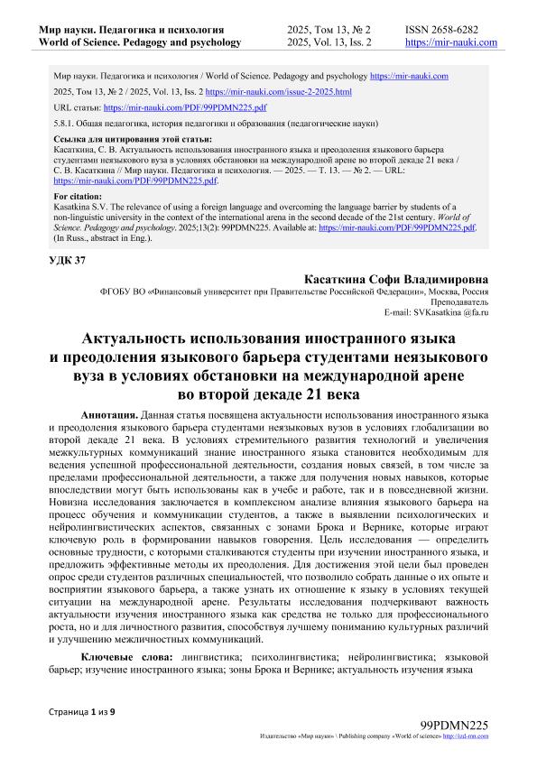и преодоления языкового барьера студентами неязыкового вуза в условиях обстановки на международной арене во второй декаде 21 века. — Текст: электронный // Мир науки. Педагогика и психология. – 2025. – № 2. — URL: https://mir-nauki.com/PDF/99PDMN225.pdf (дата обращения: 09.02.2026) — <URL:http://elib.fa.ru/art2025/bv1882.pdf>.