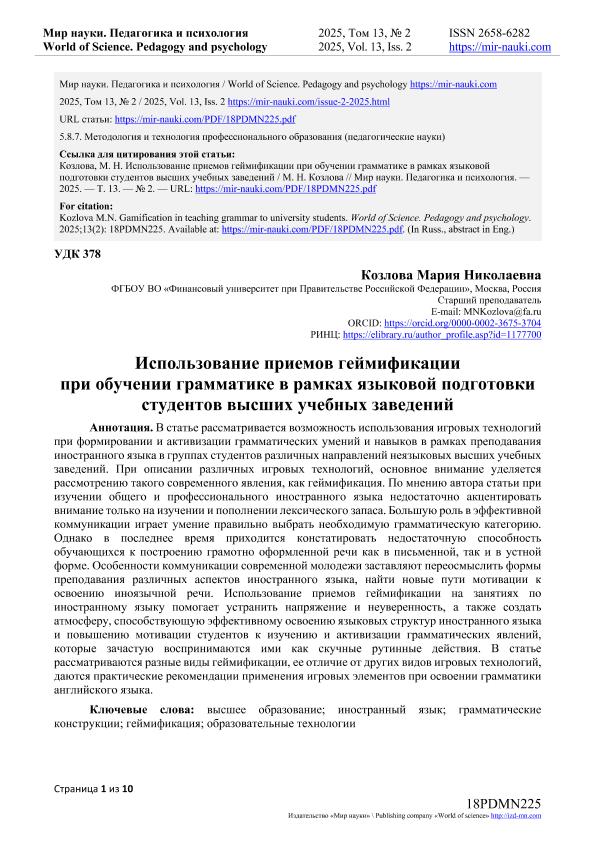 Козлова, М.Н. Использование приемов геймификации при обучении грамматике в рамках языковой подготовки студентов высших учебных заведений. — Текст: электронный // Мир науки. Педагогика и психология. – 2025. – № 2. — URL: https://mir-nauki.com/PDF/18PDMN225.pdf (дата обращения: 09.02.2026) — <URL:http://elib.fa.ru/art2025/bv1883.pdf>.
