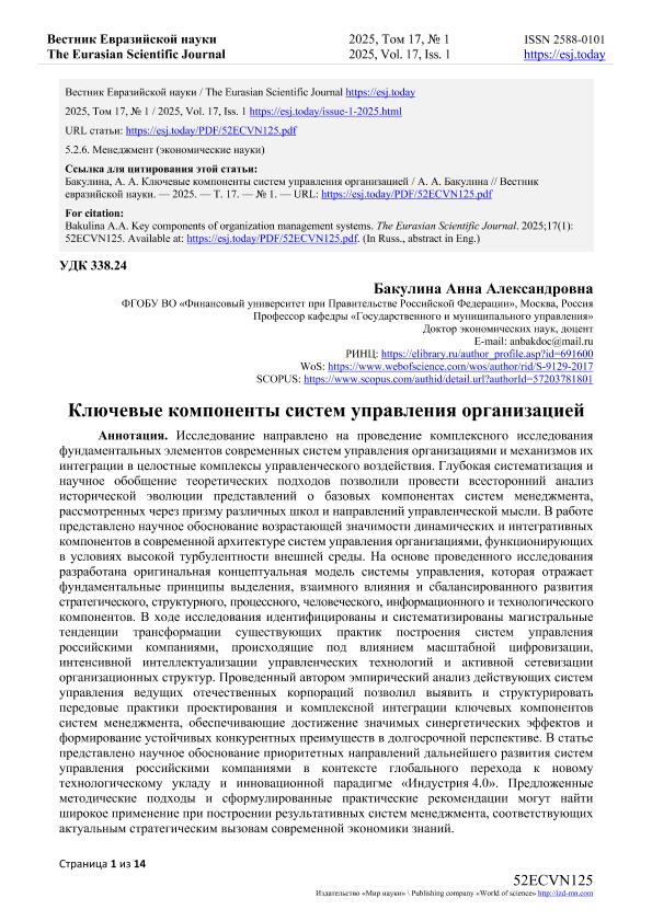 Бакулина, А.А. Ключевые компоненты систем управления организацией. — Текст: электронный // Вестник Евразийской науки. – 2025. – № 1. — URL: https://esj.today/PDF/52ECVN125.pdf (дата обращения: 13.10.2025) — <URL:http://elib.fa.ru/art2025/bv351.pdf>.