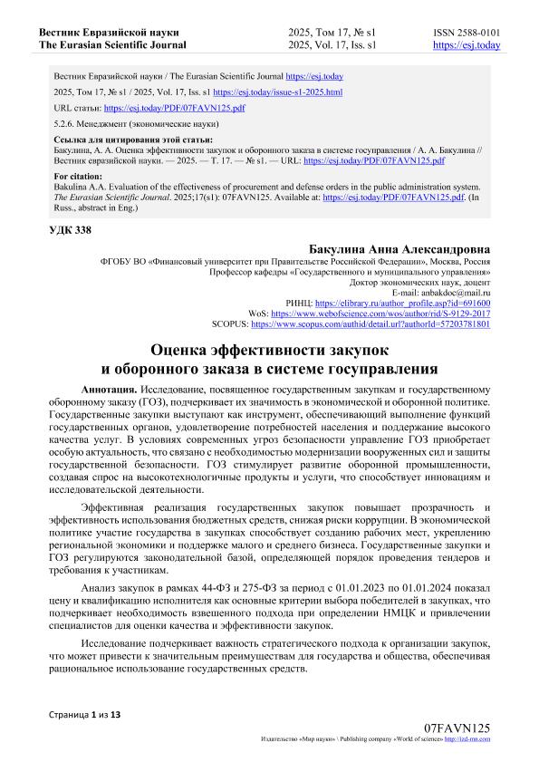 Бакулина, А.А. Оценка эффективности закупок и оборонного заказа в системе госуправления. — Текст: электронный // Вестник Евразийской науки. – 2025. – № s1. — URL: https://esj.today/PDF/07FAVN125.pdf (дата обращения: 17.09.2025) — <URL:http://elib.fa.ru/art2025/bv352.pdf>.