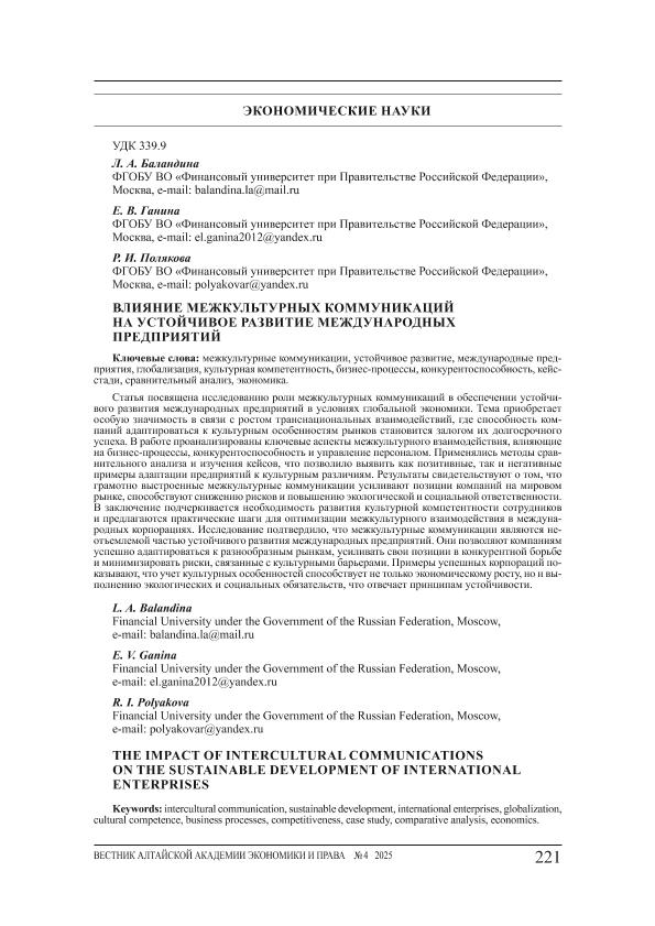 Баландина, Л.А. Влияние межкультурных коммуникаций на устойчивое развитие международных предприятий / Л.А. Баландина, Е.В. Ганина, Р.И. Полякова // Вестник Алтайской академии экономики и права. – 2025. – № 4-2. — С. 221-225. — Только в электронном виде. — <URL:http://elib.fa.ru/art2025/bv353.pdf>.