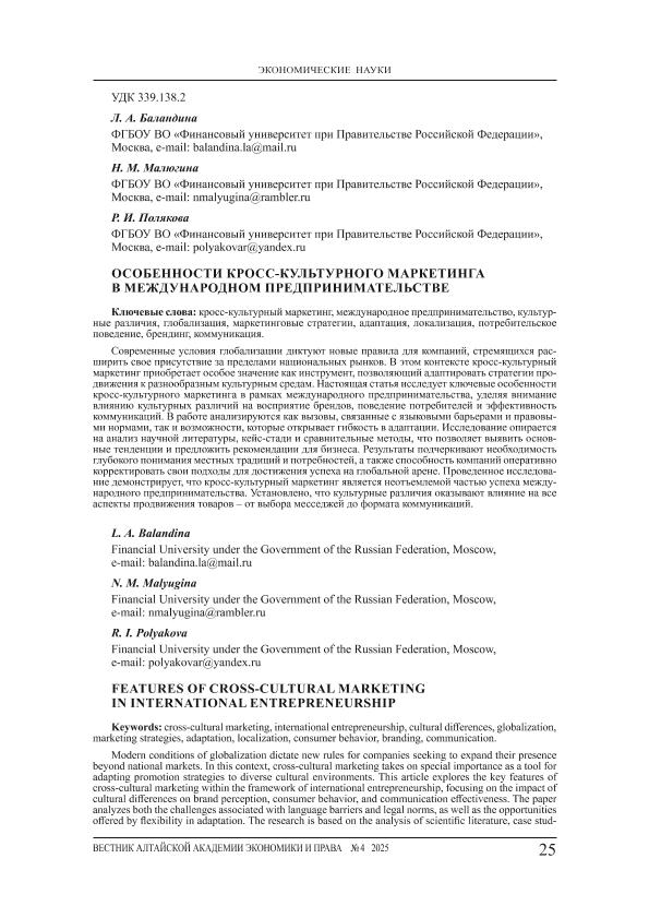 Баландина, Л.А. Особенности кросс-культурного маркетинга в международном предпринимательстве / Л.А. Баландина, Н.М. Малюгина, Р.И. Полякова // Вестник Алтайской академии экономики и права. – 2025. – № 4-1. — С. 25-29. — Только в электронном виде. — <URL:http://elib.fa.ru/art2025/bv354.pdf>.