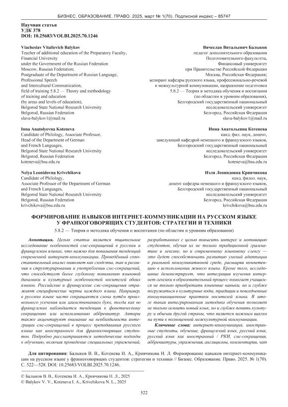 Балыков, В.В. Формирование навыков интернет-коммуникации на русском языке у франкоговорящих студентов: стратегии и техники / В.В. Балыков, И.А. Котенева, Н.Л. Кривчикова // Бизнес. Образование. Право. – 2025. – № 1. — С. 522-528. — Только в электронном виде. — <URL:http://elib.fa.ru/art2025/bv355.pdf>.