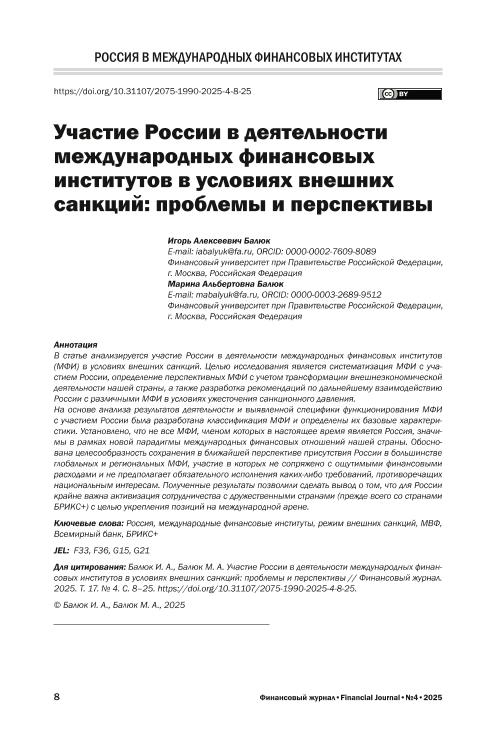 санкций: проблемы и перспективы / И.А. Балюк, М.А. Балюк // Финансовый журнал. – 2025. – № 4. — С. 8-25. — Только в электронном виде. — <URL:http://elib.fa.ru/art2025/bv356.pdf>.