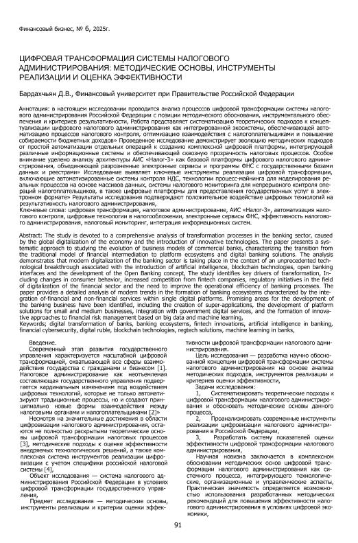 Бардахчьян, Д.В. Цифровая трансформация системы налогового администрирования: методические основы, инструменты реализации и оценка эффективности // Финансовый бизнес. – 2025. – №6. — Хранение – Олеко Дундича, 23. — <URL:http://elib.fa.ru/art2025/bv358.pdf>.