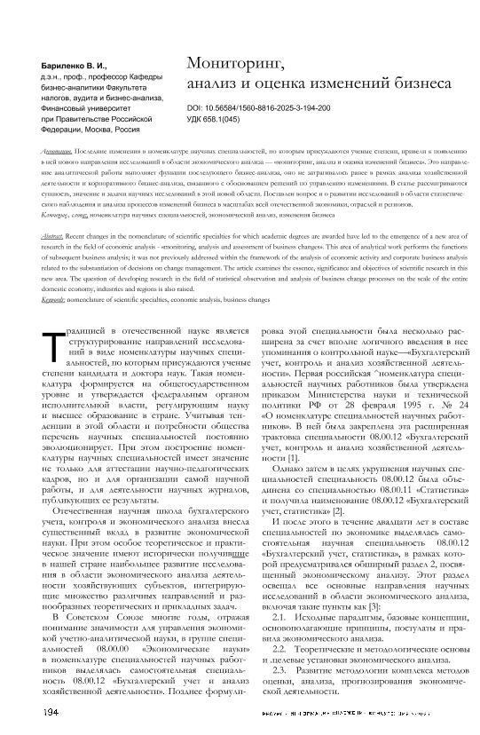 Бариленко, В.И. Мониторинг, анализ и оценка изменений бизнеса // Риск: ресурсы, информация, снабжение, конкуренция. – 2025. – С. 194-200. — Хранение – Олеко Дундича, 23. — <URL:http://elib.fa.ru/art2025/bv359.pdf>.