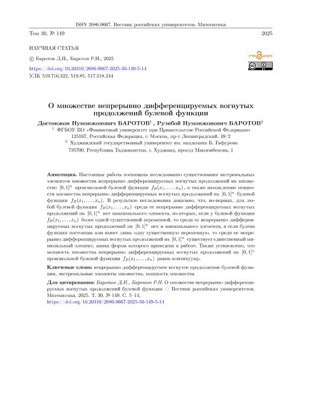 Баротов, Д.Н. О множестве непрерывно дифференцируемых вогнутых продолжений булевой функции / Д.Н. Баротов, Р.Н. Баротов // Вестник российских университетов. Математика. – 2025. – № 149. — С. 5-14. — Только в электронном виде. — <URL:http://elib.fa.ru/art2025/bv360.pdf>.