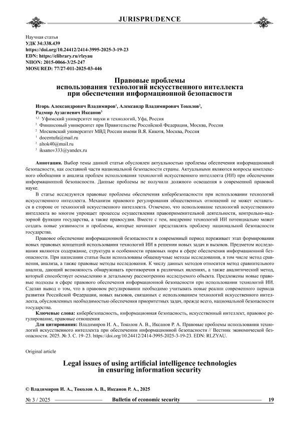 Владимиров, И.А. Правовые проблемы использования технологий искусственного интеллекта при обеспечении информационной безопасности / И.А. Владимиров, А.В. Токолов, Р.А. Иксанов // Вестник экономической безопасности. – 2025. – № 3. — С. 19-23. — Только в электронном виде. — <URL:http://elib.fa.ru/art2025/bv1410.pdf>.