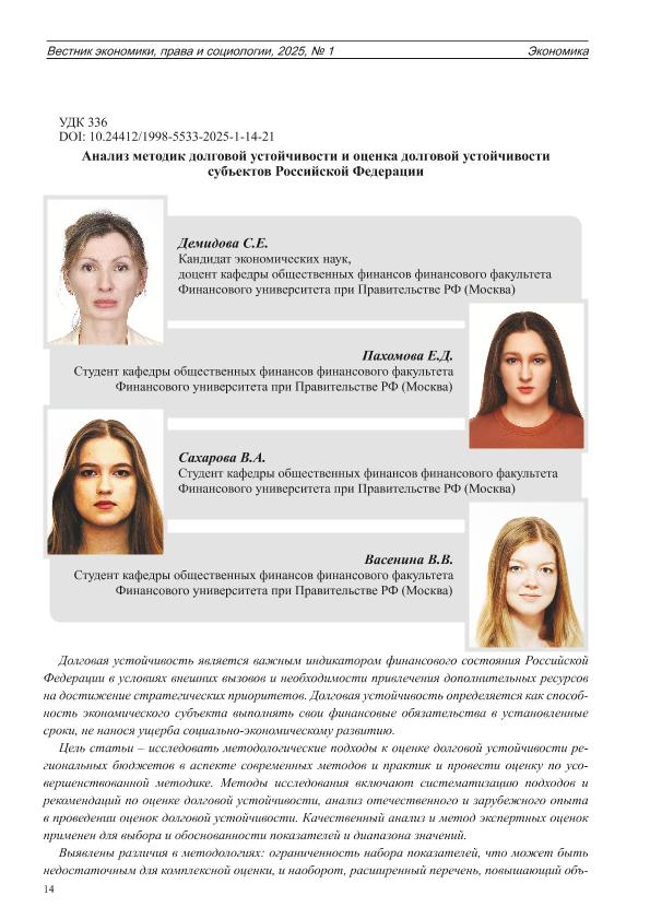 Анализ методик долговой устойчивости и оценка долговой устойчивости субъектов Российской Федерации / С.Е. Демидова, Е.Д. Пахомова, В.А. Сахарова, В.В. Васенина // Вестник экономики, права и социологии. – 2025. – № 1. — С. 14-21. — Только в электронном виде. — <URL:http://elib.fa.ru/art2025/bv1411.pdf>.