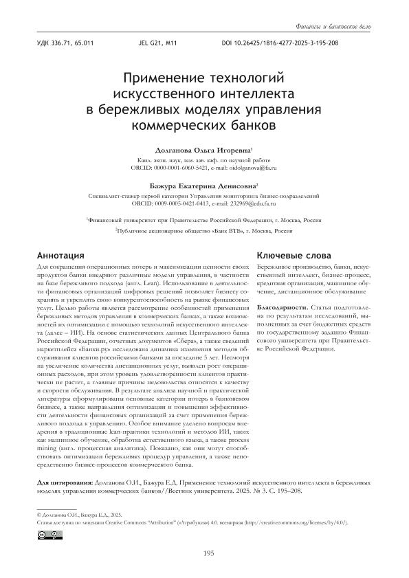 Долганова, О.И. Применение технологий искусственного интеллекта в бережливых моделях управления коммерческих банков / О.И. Долганова, Е.Д. Бажура // Вестник университета. – 2025. – № 3. — С. 195-208. — Только в электронном виде. — <URL:http://elib.fa.ru/art2025/bv1412.pdf>.