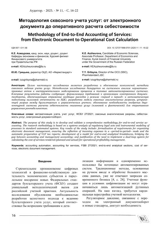 Азжеурова, К.Е. Методология сквозного учета услуг: от электронного документа до оперативного расчета себестоимости / К.Е. Азжеурова, Ю.Ю. Грицына // Аудитор. – 2025. – № 11. — С. 16-22. — Хранение – Верхняя Масловка, 15. — <URL:http://elib.fa.ru/art2025/bv1413.pdf>.