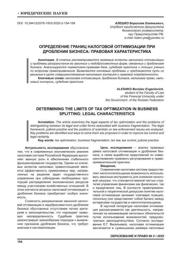 Алешко, Б.Е. Определение границ налоговой оптимизации при дроблении бизнеса: правовая характеристика // Образование и право. – 2025. – № 2. — С. 154-158. — Только в электронном виде. — <URL:http://elib.fa.ru/art2025/bv1828.pdf>.
