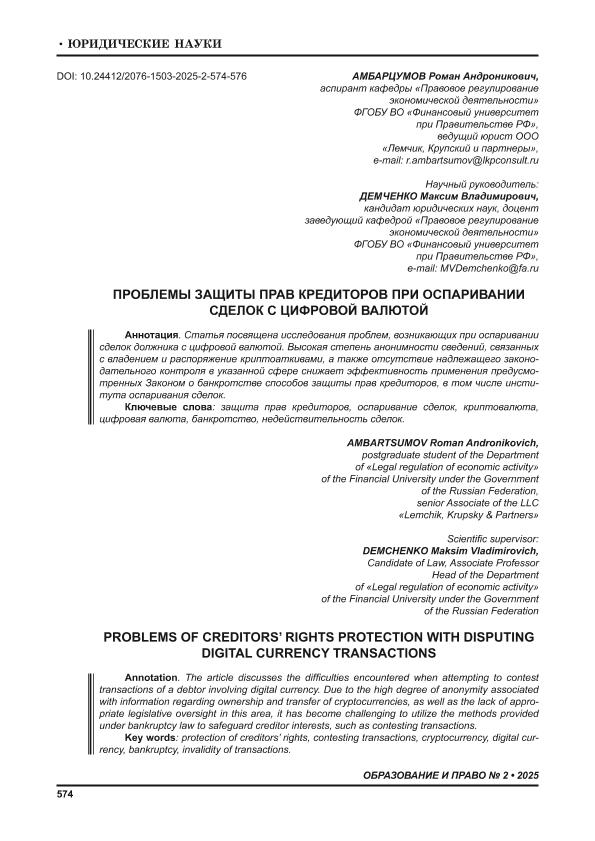 Амбарцумов, Р.А. Проблемы защиты прав кредиторов при оспаривании сделок с цифровой валютой // Образование и право. – 2025. – № 2. — С. 574-576. — Только в электронном виде. — <URL:http://elib.fa.ru/art2025/bv1829.pdf>.
