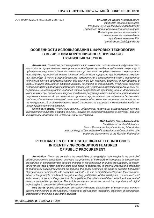 Басангов, Д.А. Особенности использования цифровых технологий в выявлении коррупционных признаков публичных закупок // Образование и право. – 2025. – № 2. — С. 217-224. — Только в электронном виде. — <URL:http://elib.fa.ru/art2025/bv1830.pdf>.