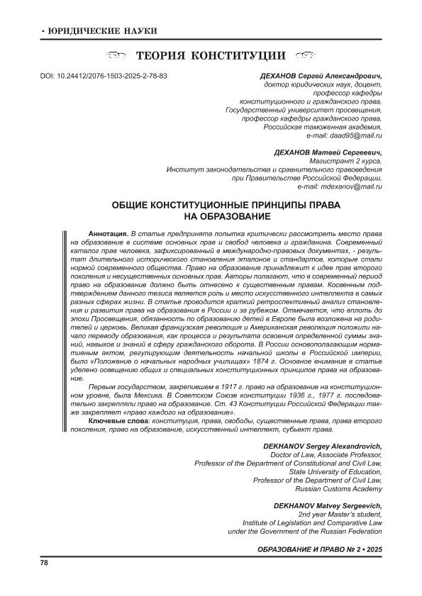 Деханов, С.А. Общие конституционные принципы права на образование / С.А. Деханов, М.С. Деханов // Образование и право. – 2025. – № 2. — С. 78-83. — Только в электронном виде. — <URL:http://elib.fa.ru/art2025/bv1831.pdf>.