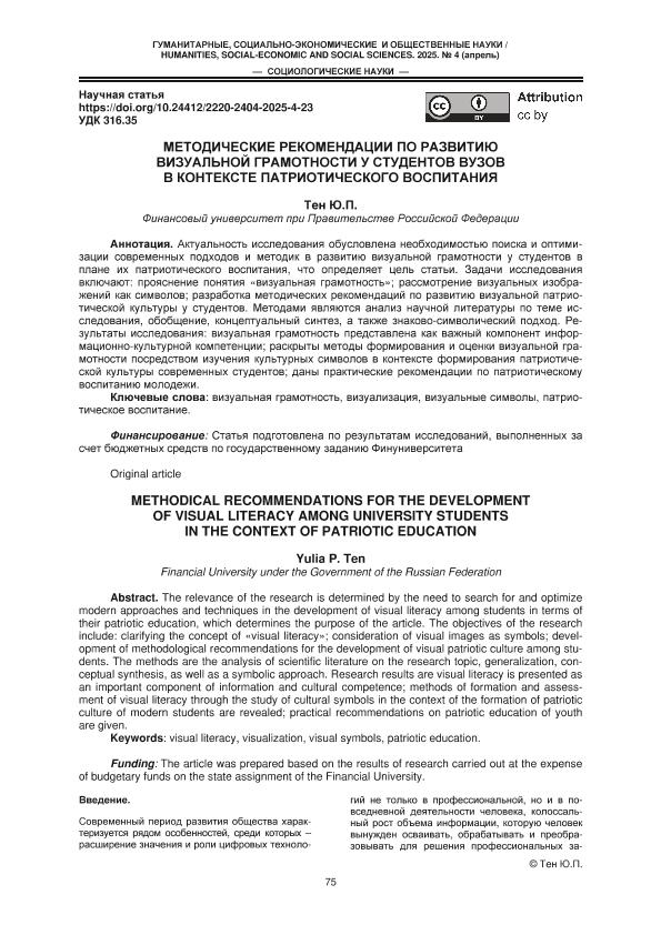 Тен, Ю.П. Методические рекомендации по развитию визуальной грамотности у студентов вузов в контексте патриотического воспитания // Гуманитарные, социально-экономические и общественные науки. – 2025. – № 4. — С.75-80. — Только в электронном виде. — <URL:http://elib.fa.ru/art2025/bv681.pdf>.