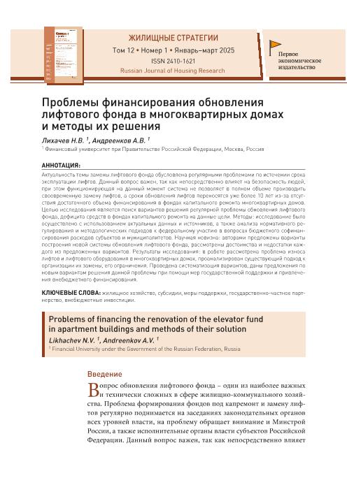 Лихачев, Н.В. Проблемы финансирования обновления лифтового фонда в многоквартирных домах и методы их решения / Н.В. Лихачев, А.В. Андреенков // Жилищные стратегии. – 2025. – № 1. — С. 101-116. — Только в электронном виде. — <URL:http://elib.fa.ru/art2025/bv682.pdf>.