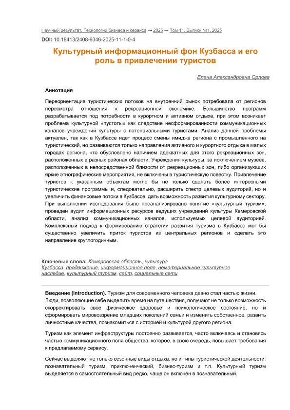 Орлова, Е.А. Культурный информационный фон Кузбасса и его роль в привлечении туристов. — Текст: электронный // Научный результат. Технологии бизнеса и сервиса. – 2025. – № 1. — С. 55-69.- URL: https://rrbusiness.ru/media/business/2025/1/Бизнес_и_сервис-46-56.pdf. - Дата публикации: 30.03.2025 — <URL:http://elib.fa.ru/art2025/bv684.pdf>.