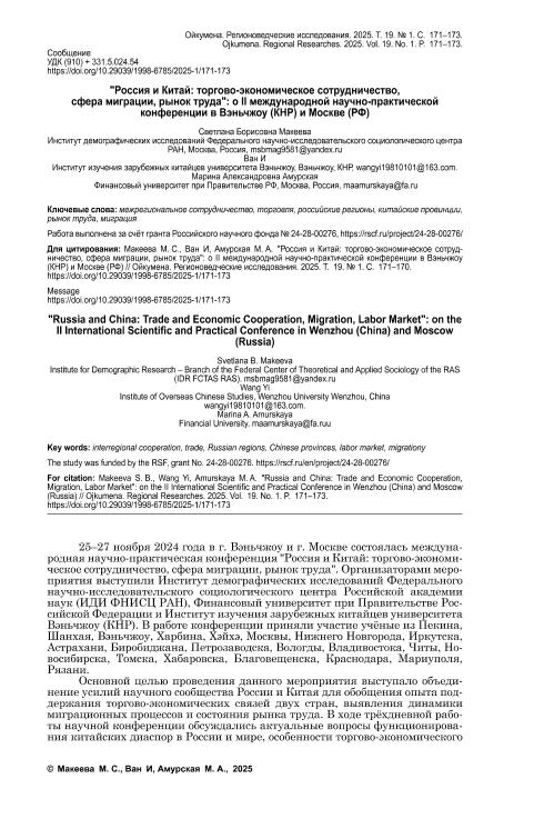 Макеева, С.Б. "Россия и Китай: торгово-экономическое сотрудничество, сфера миграции, рынок труда": о II международной научно-практической конференции в Вэньчжоу (КНР) и Москве (РФ) / С.Б. Макеева, Ван И, М.А. Амурская // Ойкумена. Регионоведческие исследования. – 2025. – № 1. — C. 171-173. — Только в электронном виде. — <URL:http://elib.fa.ru/art2025/bv685.pdf>.
