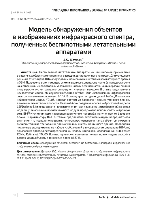 Щетинин, Е.Ю. Модель обнаружения объектов в изображениях инфракрасного спектра, полученных беспилотными летательными аппаратами // Прикладная информатика. – 2025. – № 1. — С. 16-27. — Только в электронном виде. — <URL:http://elib.fa.ru/art2025/bv688.pdf>.