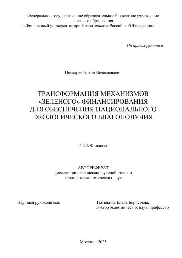 Пискарев, Антон Вячеславович. Трансформация механизмов «зеленого» финансирования для обеспечения национального экологического благополучия: автореферат дис. ... кандидата экономических наук ; спец. 5.2.4, защищена 24.12.2025 / А.В. Пискарев; Место защиты: Финуниверситет, Работа выполнена: Финуниверситет; Кафедра корпоративных финансов и корпоративного управления. — Москва, 2025. — 26 с. — Доступ из локальной сети Финуниверситета (чтение). — <URL:http://elib.fa.ru/avtoreferat/Piskarev.pdf>.