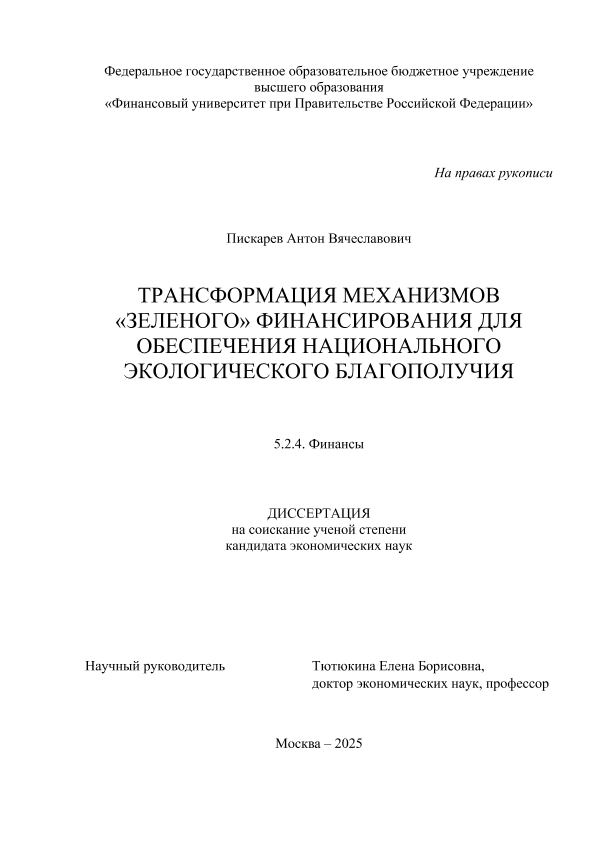 Пискарев, Антон Вячеславович. Трансформация механизмов «зеленого» финансирования для обеспечения национального экологического благополучия: дис. ... кандидата экономических наук ; спец. 5.2.4, защищена 24.12.2025 / А.В. Пискарев; Место защиты: Финуниверситет, Работа выполнена: Финуниверситет; Кафедра корпоративных финансов и корпоративного управления. — Москва, 2025. — 207 с. — Доступ из локальной сети Финуниверситета (чтение). — <URL:http://elib.fa.ru/avtoreferat/Piskarev_diss.pdf>.