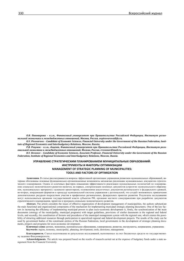 Пивоварова, О.В. Управление стратегическим планированием муниципальных образований: инструменты и факторы оптимизации / О.В. Пивоварова, Р.В. Ревунов // Вестник Академии знаний. – 2025. – № 3. — С. 330-333. — Только в электронном виде. — <URL:http://elib.fa.ru/art2025/bv1526.pdf>.