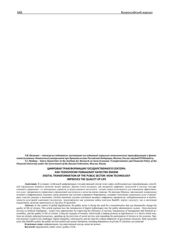 Пимкина, Т.И. Цифровая трансформация государственного сектора: как технологии повышают качество жизни // Вестник Академии знаний. – 2025. – № 3. — С. 668-672. — Только в электронном виде. — <URL:http://elib.fa.ru/art2025/bv1527.pdf>.