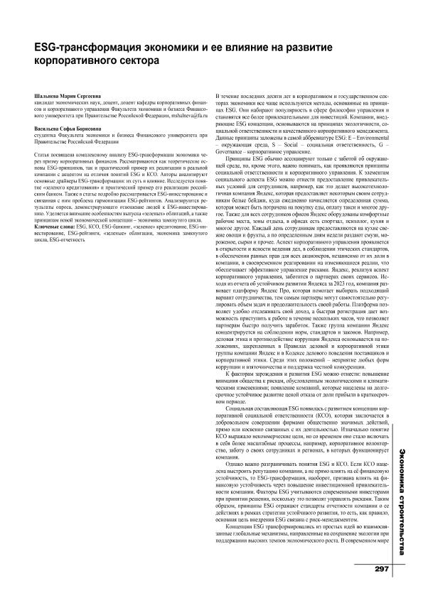 Шальнева, М.С. ESG-трансформация экономики и ее влияние на развитие корпоративного сектора / М.С. Шальнева, С.Б. Васильева // Экономика строительства. – 2025. – № 5. — С. 297-299. — Только в электронном виде. — <URL:http://elib.fa.ru/art2025/bv1612.pdf>.
