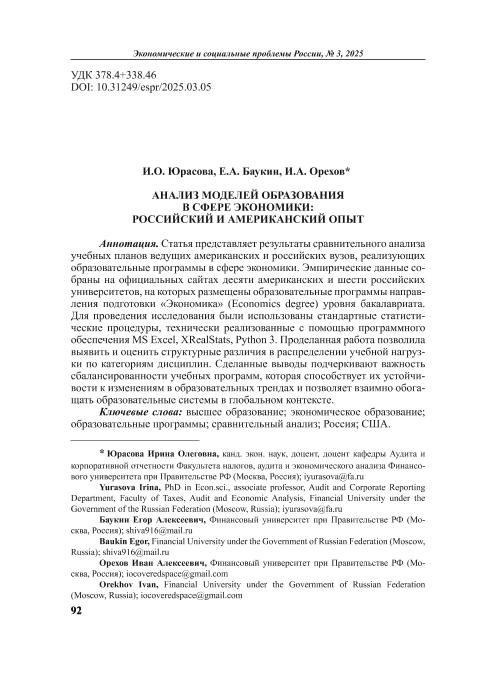 Юрасова, И.О. Анализ моделей образования в сфере экономики: российский и американский опыт / И.О. Юрасова, Е.А. Баукин, И.А. Орехов // Экономические и социальные проблемы России. – 2025. – № 3. — С. 92-108 — <URL:http://elib.fa.ru/art2025/bv1641.pdf>.