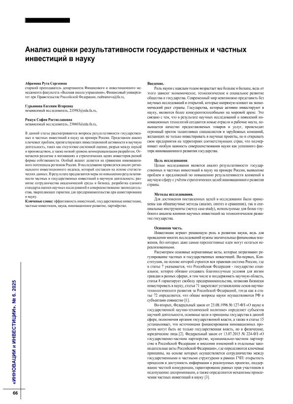 Абрамова, Р.С. Анализ оценки результативности государственных и частных инвестиций в науку / Р.С. Абрамова, Е.И. Гурьянова, С.Р. Рижук // Инновации и инвестиции. – 2025. – № 6. — С. 66-69. — Только в электронном виде. — <URL:http://elib.fa.ru/art2025/bv1739.pdf>.