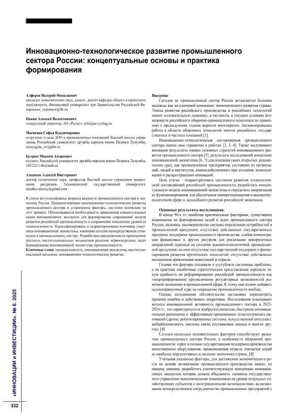 Инновационно-технологическое развитие промышленного сектора России: концептуальные основы и практика формирования / В.Н. Алферов, А.В. Панин, С.В. Мосягина [и др.] // Инновации и инвестиции. – 2025. – № 6. — С. 332-335. — Только в электронном виде. — <URL:http://elib.fa.ru/art2025/bv1741.pdf>.