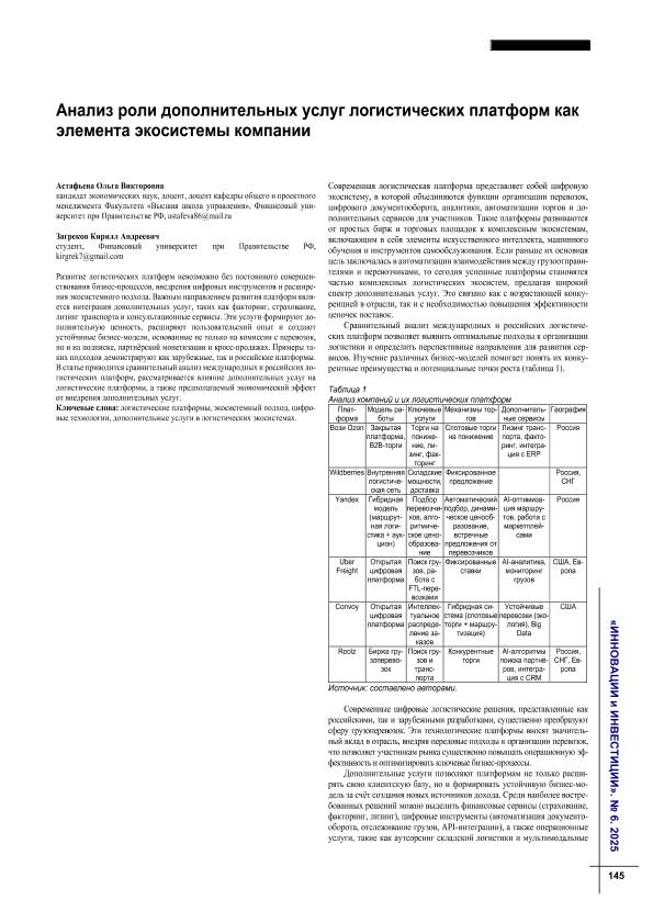 Астафьева, О.В. Анализ роли дополнительных услуг логистических платформ как элемента экосистемы компании / О.В. Астафьева, К.А. Загреков // Инновации и инвестиции. – 2025. – № 6. — С. 145-147. — Только в электронном виде. — <URL:http://elib.fa.ru/art2025/bv1742.pdf>.