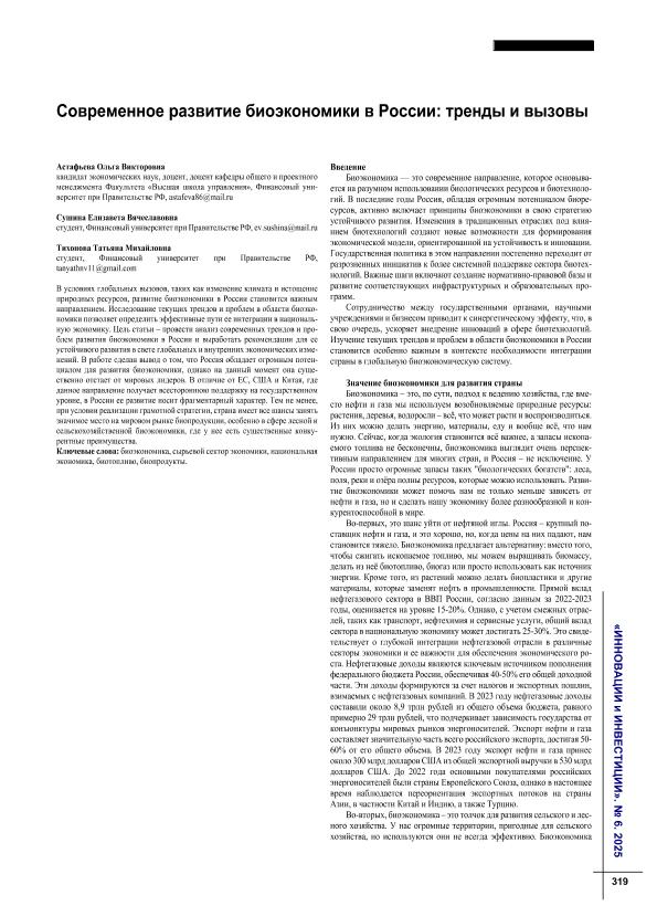 Астафьева, О.В. Современное развитие биоэкономики в России: тренды и вызовы / О.В. Астафьева, Е.В. Сушина, Т.М. Тихонова // Инновации и инвестиции. – 2025. – № 6. — С. 319-321. — Только в электронном виде. — <URL:http://elib.fa.ru/art2025/bv1743.pdf>.