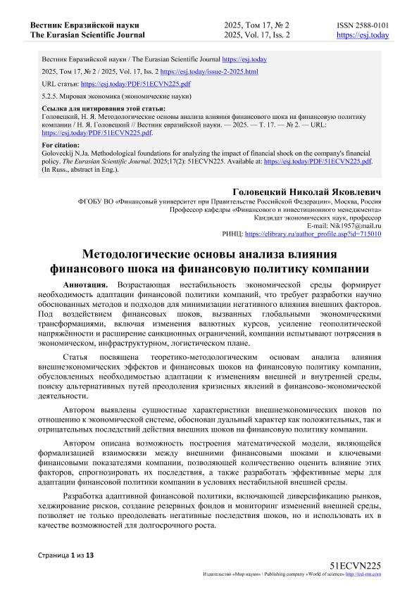 Головецкий, Н.Я. Методологические основы анализа влияния финансового шока на финансовую политику компании. — Текст: электронный // Вестник Евразийской науки. – 2025. – № 2. — URL: https://esj.today/PDF/51ECVN225.pdf (дата обращения: 20.10.2025) — <URL:http://elib.fa.ru/art2025/bv444.pdf>.