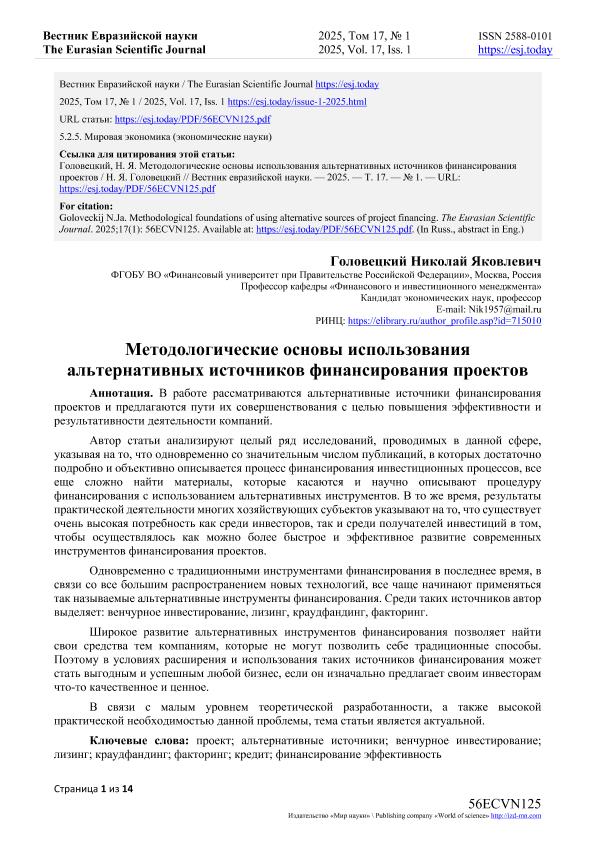 Головецкий, Н.Я. Методологические основы использования альтернативных источников финансирования проектов. — Текст: электронный // Вестник Евразийской науки. – 2025. – № 1. — URL: https://esj.today/PDF/56ECVN125.pdf (дата обращения: 13.10.2025) — <URL:http://elib.fa.ru/art2025/bv445.pdf>.