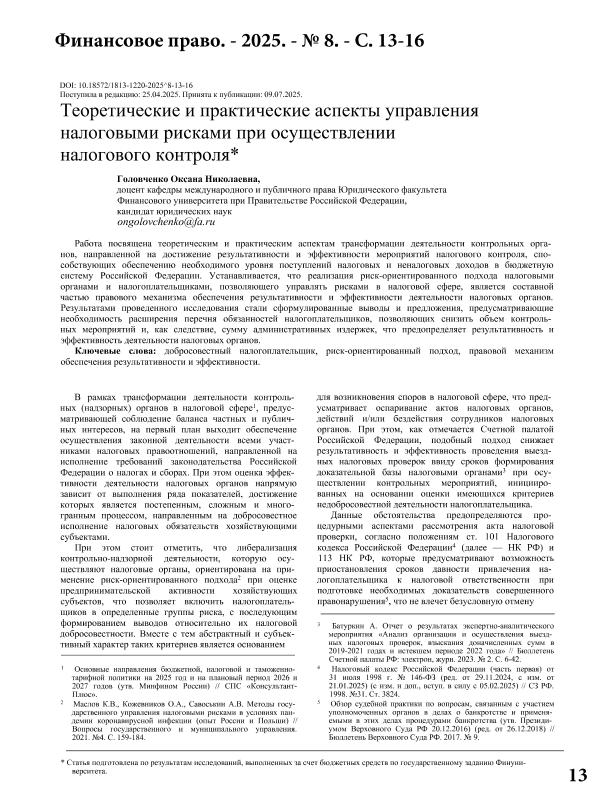 Головченко, О.Н. Теоретические и практические аспекты управления налоговыми рисками при осуществлении налогового контроля // Финансовое право. – 2025. – № 8. — С. 13-16. — Хранение – Щербаковская, 38. — <URL:http://elib.fa.ru/art2025/bv446.pdf>.