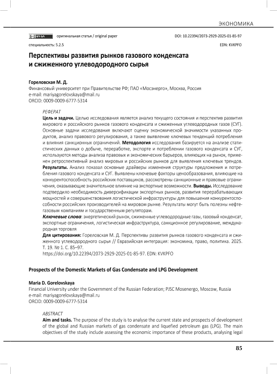 Гореловская, М.Д. Перспективы развития рынков газового конденсата и сжиженного углеводородного сырья // Евразийская интеграция: экономика, право, политика. – 2025. – № 1. — С. 85-97. — Только в электронном виде. — <URL:http://elib.fa.ru/art2025/bv448.pdf>.