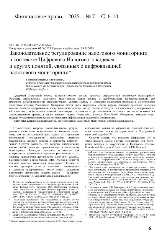 Григоров, К.Н. Законодательное регулирование налогового мониторинга в контексте Цифрового Налогового кодекса и других понятий, связанных с цифровизацией налогового мониторинга // Финансовое право. – 2025. – № 7. — С. 6-10. — Хранение – Щербаковская, 38. — <URL:http://elib.fa.ru/art2025/bv451.pdf>.