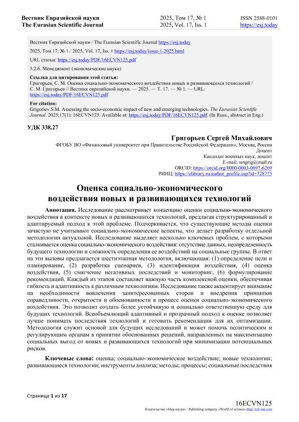 Григорьев, С.М. Оценка социально-экономического воздействия новых и развивающихся технологий. — Текст: электронный // Вестник Евразийской науки. – 2025. – № 1. — URL: https://esj.today/PDF/16ECVN125.pdf (дата обращения: 13.10.2025) — <URL:http://elib.fa.ru/art2025/bv452.pdf>.