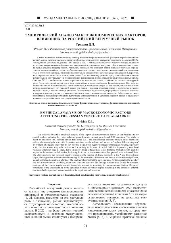 Гришин, Д.Л. Эмпирический анализ макроэкономических факторов, влияющих на российский венчурный рынок // Фундаментальные исследования. – 2025. – № 5. — С. 21-26. — Только в электронном виде. — <URL:http://elib.fa.ru/art2025/bv453.pdf>.